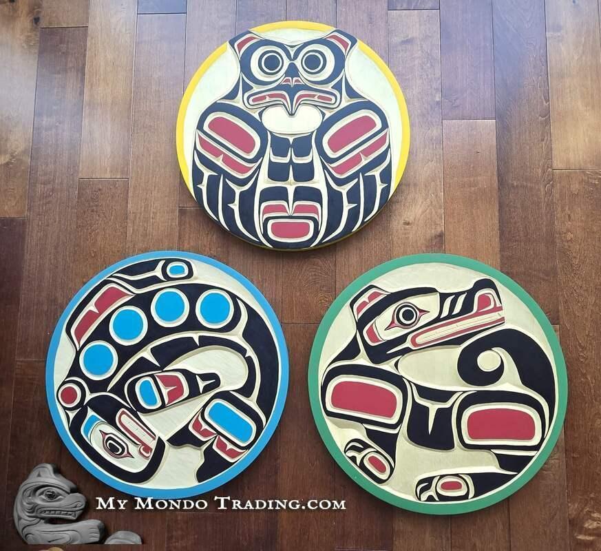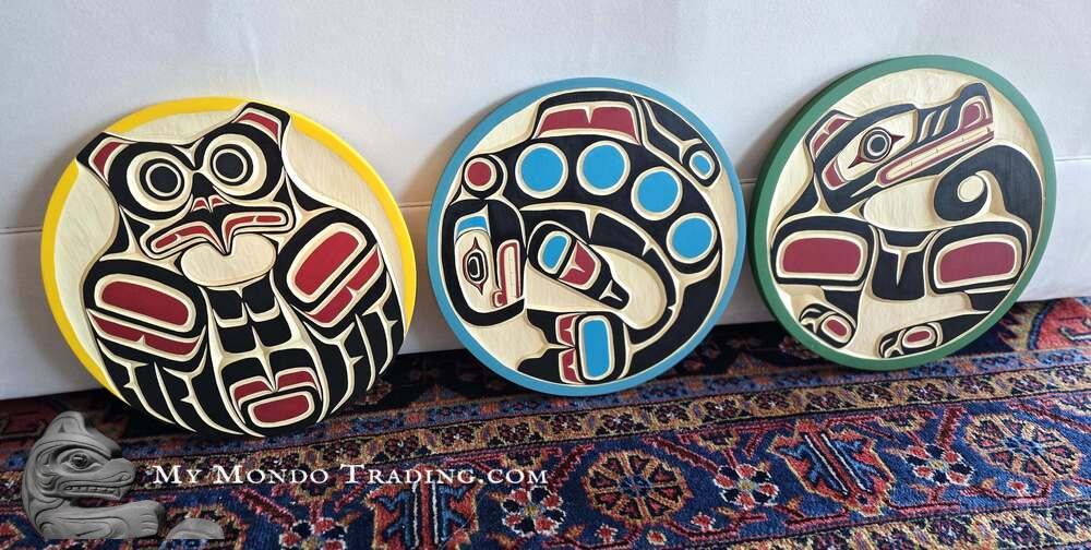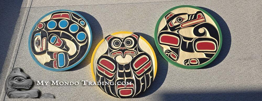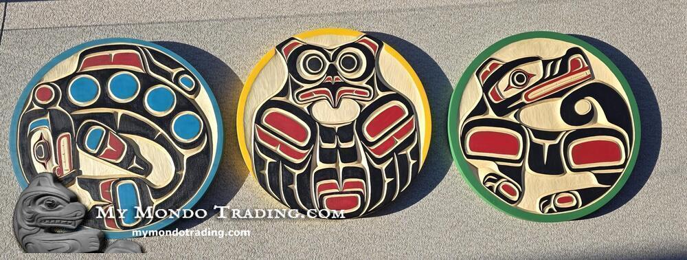 Complete Set of 3 gorgeous Cedar wall art carvings by Peter Smith, a member of the Kwakiulth First Nation, originating from Gilford Island. Peter is very passionate about his culture and traditions and is proud to say that he has Hereditary Chief standing passed on to him from his father, the late Chief Charles Smith.
