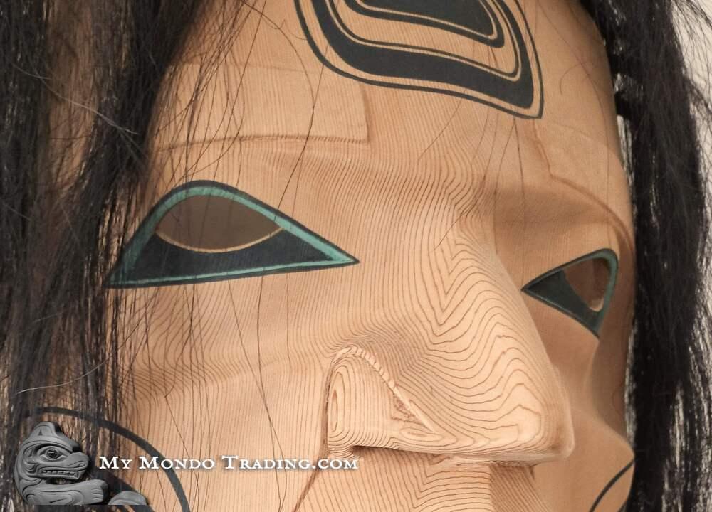 Please have a close look at this gorgeous grain in the cedar - Kolten picked the perfect piece of wood for this mask. The sanding and carving is close to perfection, very powerful and rich expression.