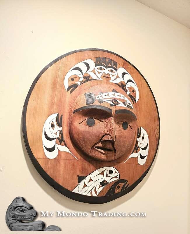 Tim always tells a story with his pieces. This is truly powerful - very rich and as you can see, fully hand made, hand carved, hand painted, no machines used at all!!! Old red cedar, beautiful piece of wood. The moon's face is hollowed out of one piece of wood; it's not mounted on the top. Tim put so much work into his pieces. They are just marvelous and well worth it. It's just getting more and more difficult to find these kinds of works. Old school, real, teaching of nature's ways and the circle of life. So important.