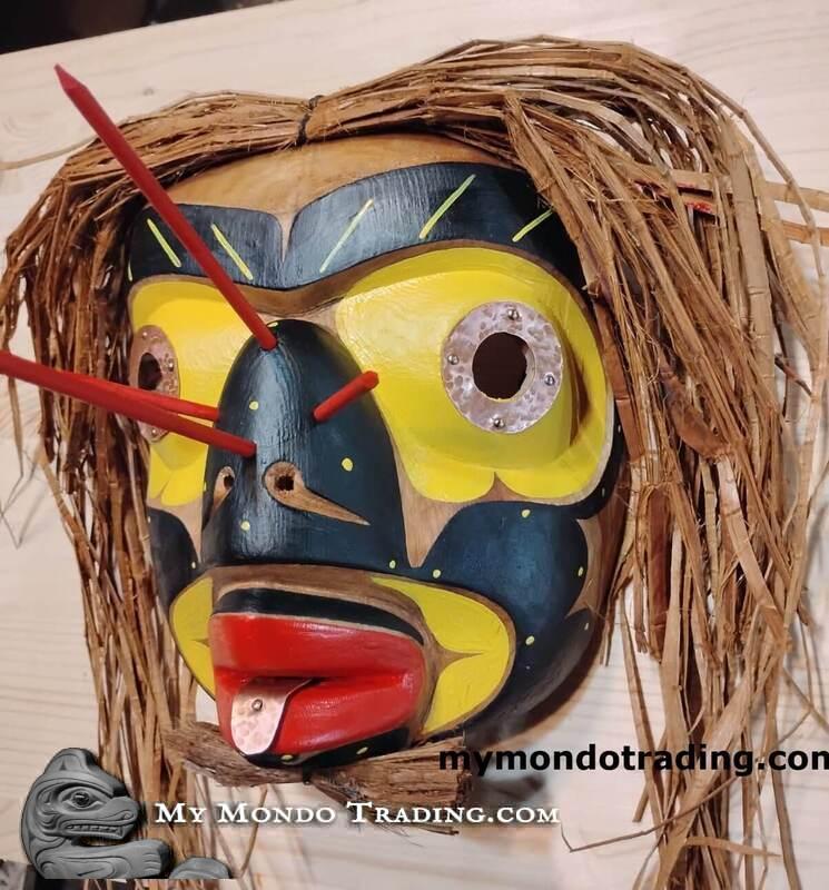 with lots of cedar bark, hand carved, hand painted by Hereditary Chief David Mungo Knox, originating from Fort Rupert, British Columbia, Canada. The carving is detailed, "stings" in the forehead and nose, signed at the back, hanger already attached. The eyes are inlaid with copper, and please look at the little copper tongue sticking out - adorable.